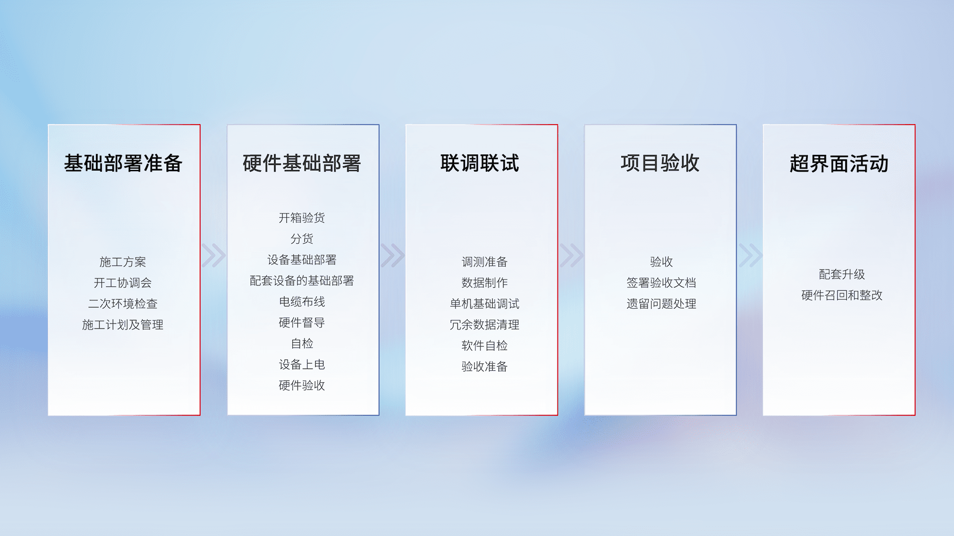从基础部署准备、、、、硬件基础部署、、联调联试、、、项目验收、、、越界面活动的全过程可追溯,,保证施工质量和进度。。。