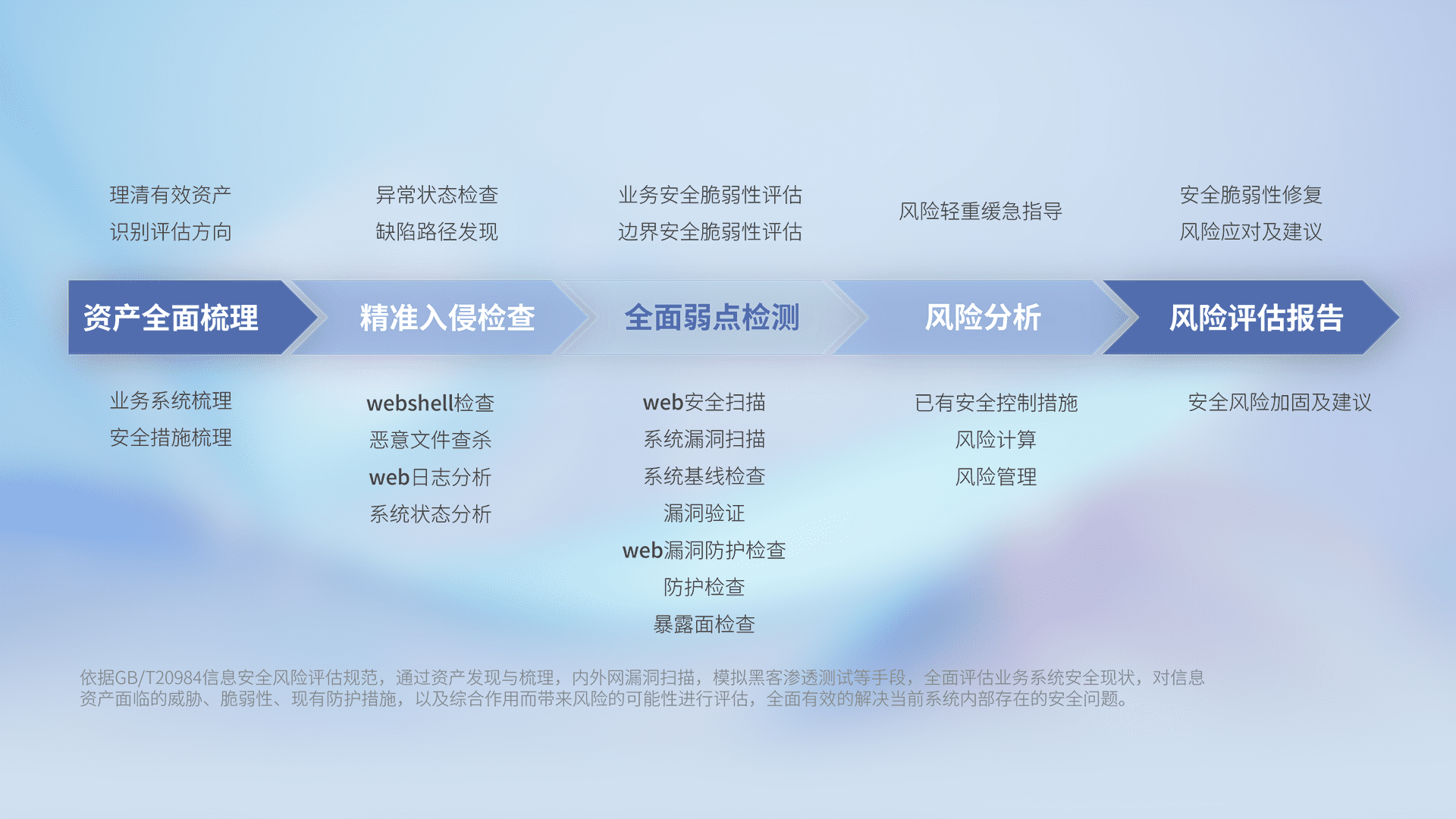 针对客户行业特性,,,以专业的安全服务+多厂商联合解决方案提供专属的一站式安全管理服务,,帮助客户全面感知网络空间威胁,,基于识别、、、、检测、、分析、、、防护、、、、监测、、、、响应的服务理论模型,,,从方案咨询、、、集成交付、、、、评估验证、、、优化加固、、运维运营,,,,致力于为客户提供完整的闭环管理式安全服务。。以实战经验为客户打造高抵御风险的安全体系,,,帮助客户发现威胁、、对抗威胁、、、处置威胁,,,不断积累安全对抗能力,,,持续保障数字化安全。。